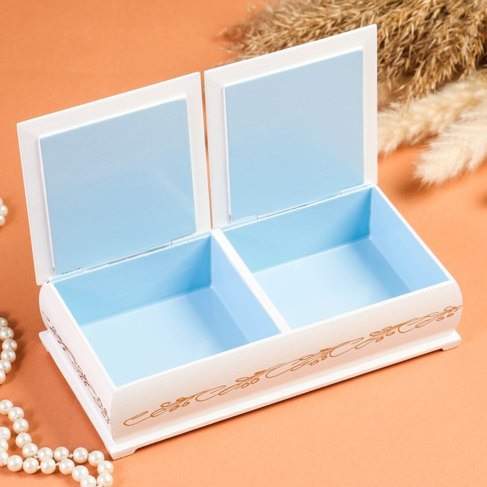 Шкатулка изготовлена из дерева, покрыта краской. Заранее напечатанное изображение приклеено и покрыто лаком. Дополнительно мастер наносит узор.