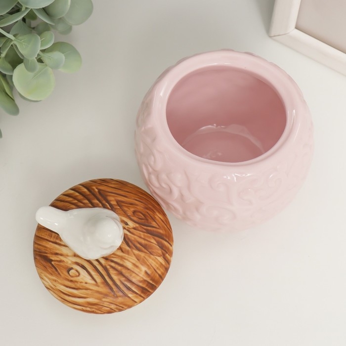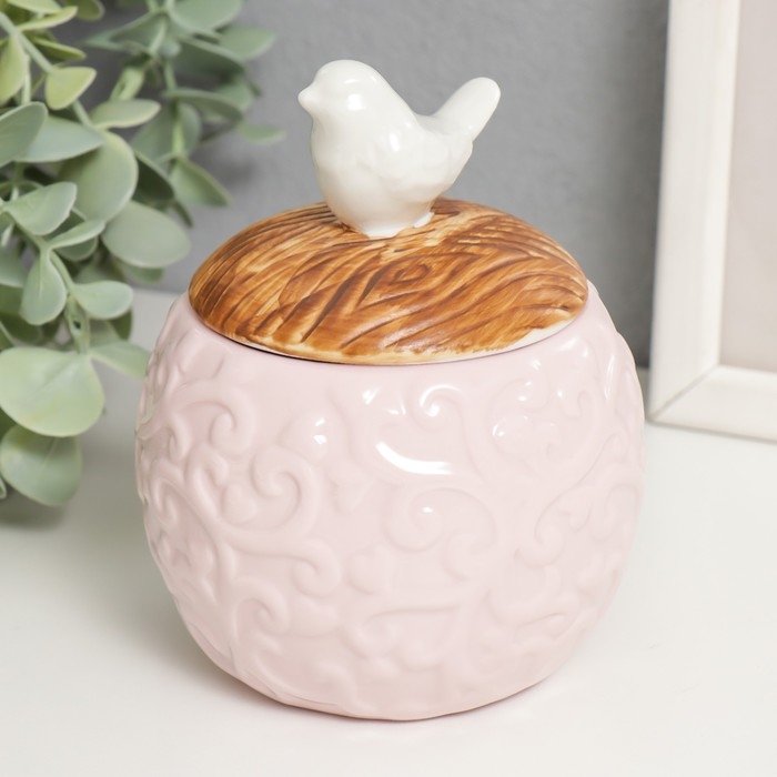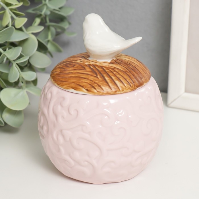 Шкатулка керамика круглая "Белая птичка" розовый 9х9х12,5 см