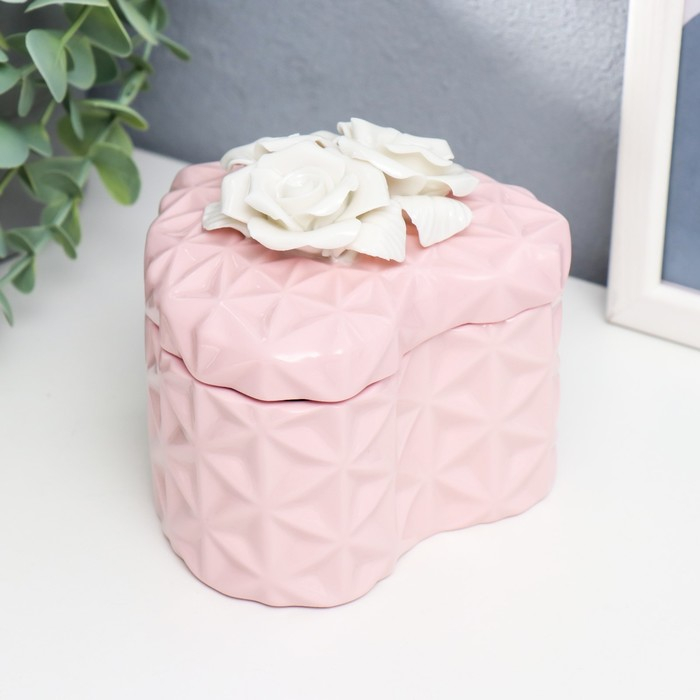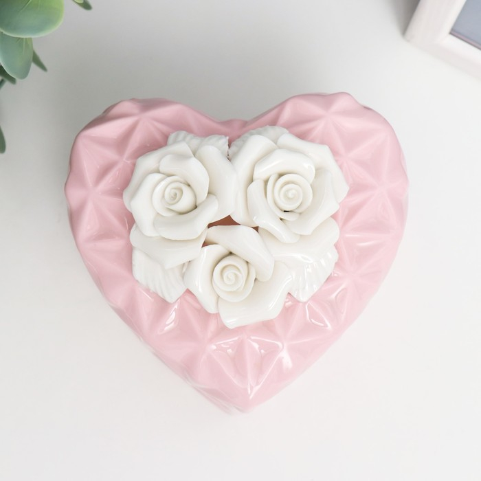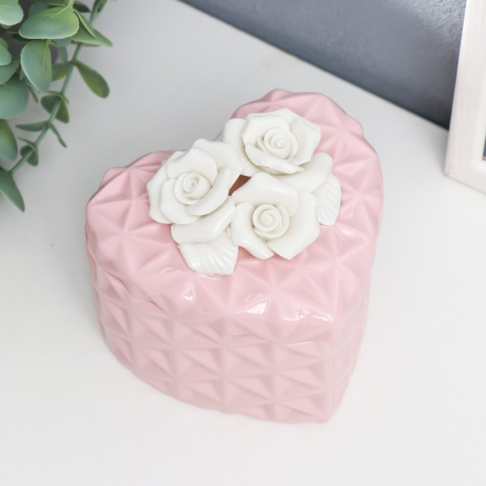 Шкатулка керамика "Три белых розы. Геометрия" сердце розовое 10х11х11 см