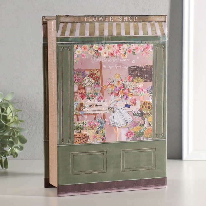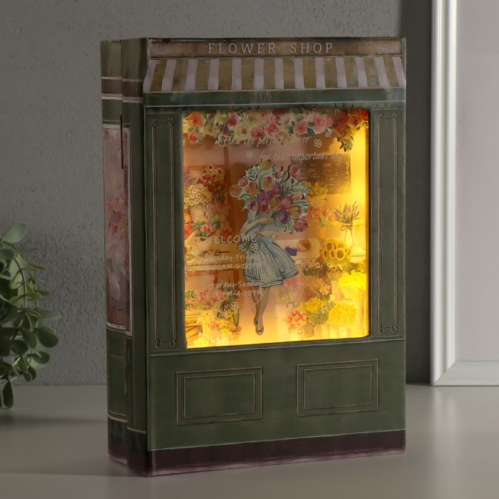 Шкатулка-книга дерево, кожзам, свет "Цветочный магазин" 28х19х7,6 см