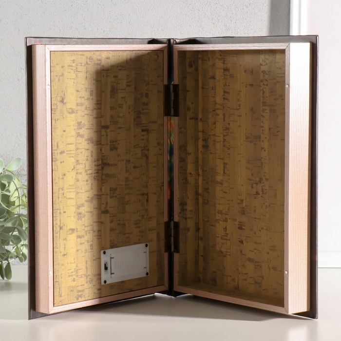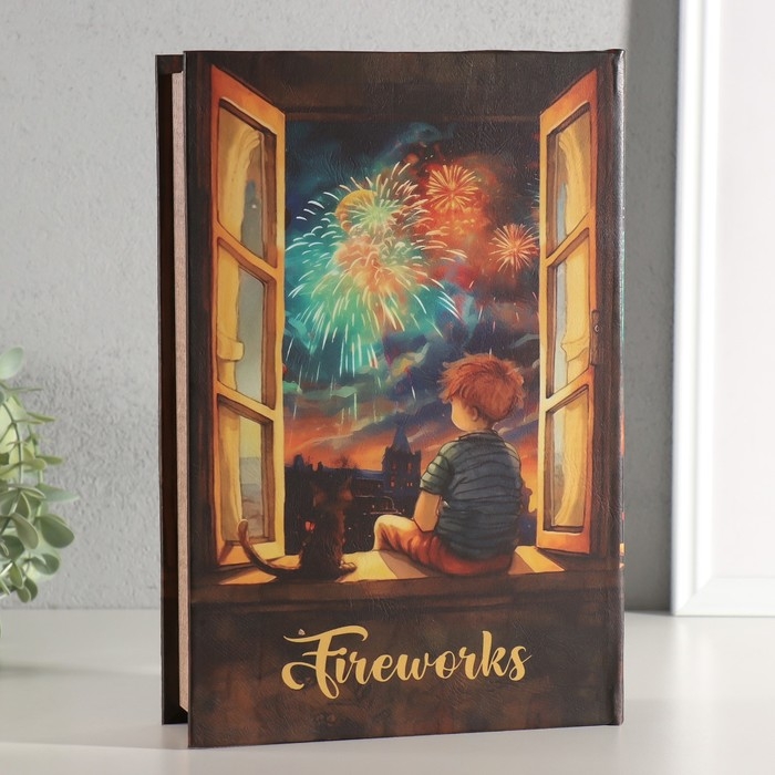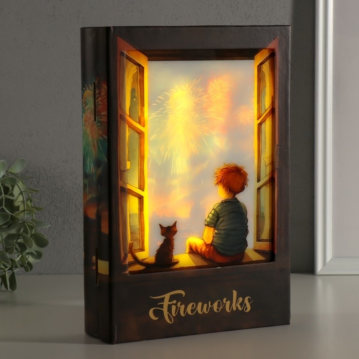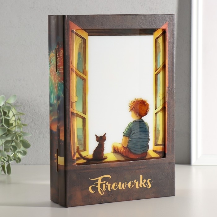 Шкатулка-книга дерево, кожзам, свет "Малыш и кот наблюдают за салютом" 28х19х6 см