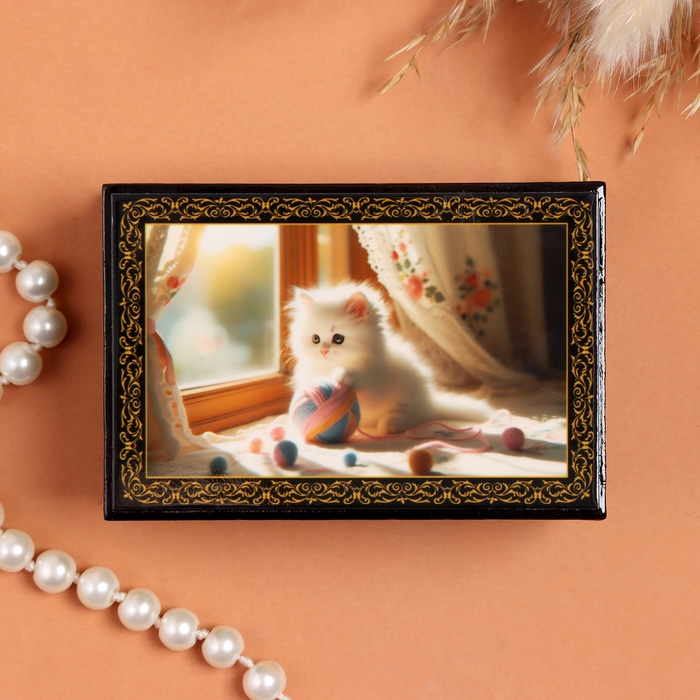 Шкатулка «Котенок», черная, 6×9 см, лаковая миниатюра
