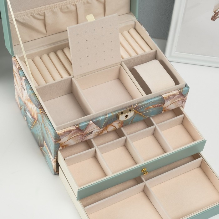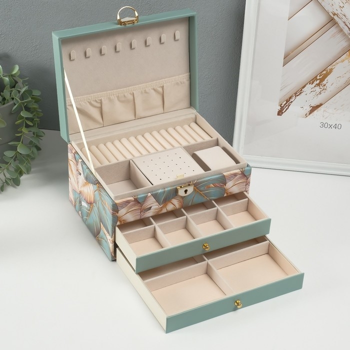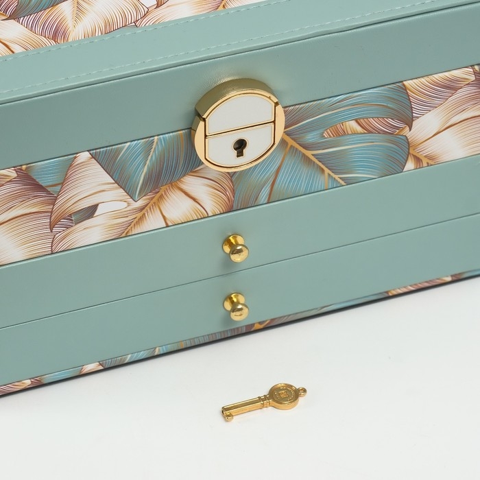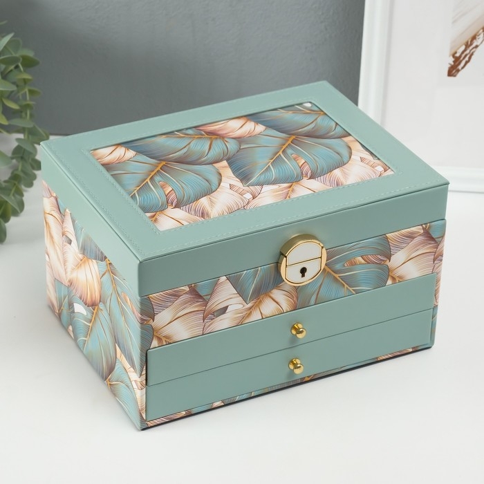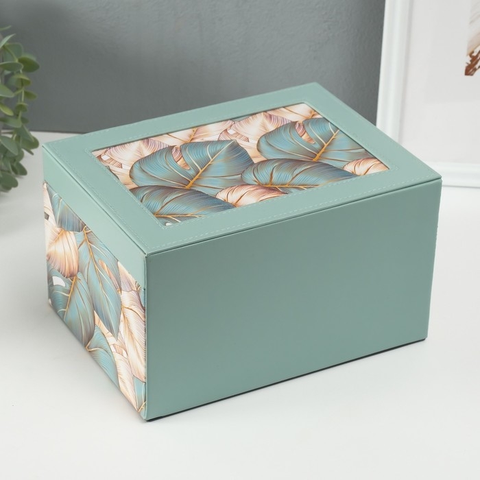 Шкатулка кожзам для украшений "Пальмовые листья" зелёная 17,5х23,5х14 см