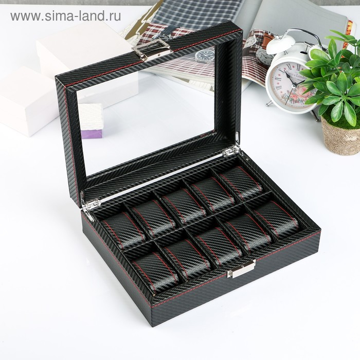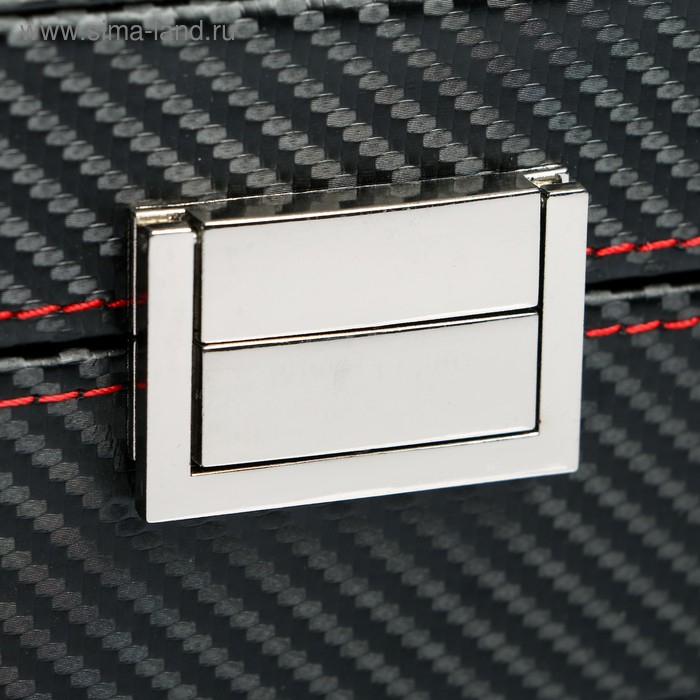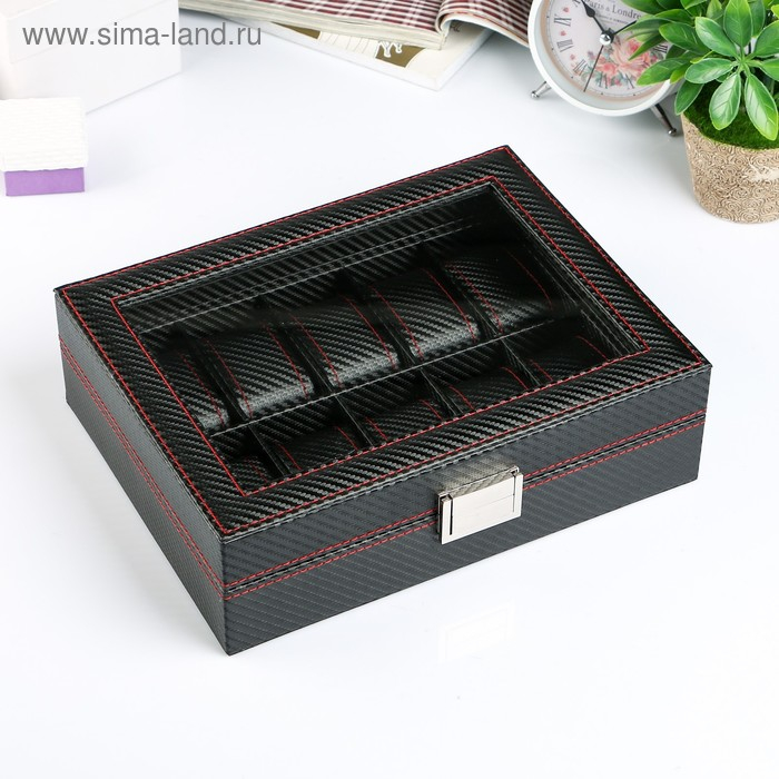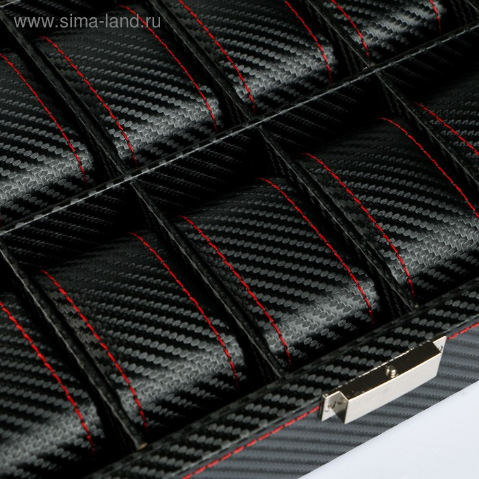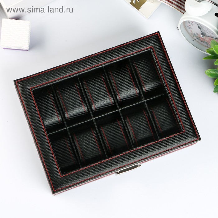 Шкатулка кожзам под часы 10 отделений "Карбон с красной строчкой" 8х28х21 см