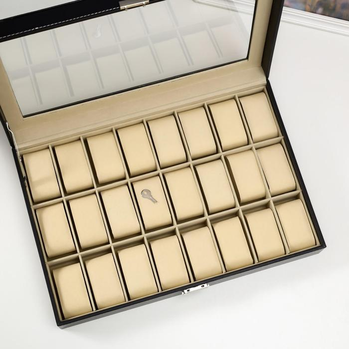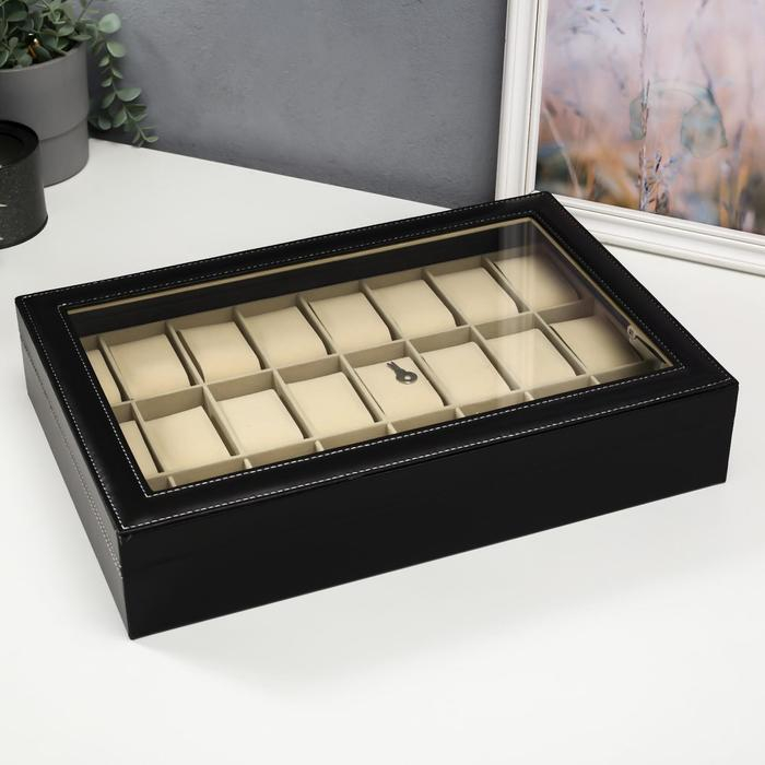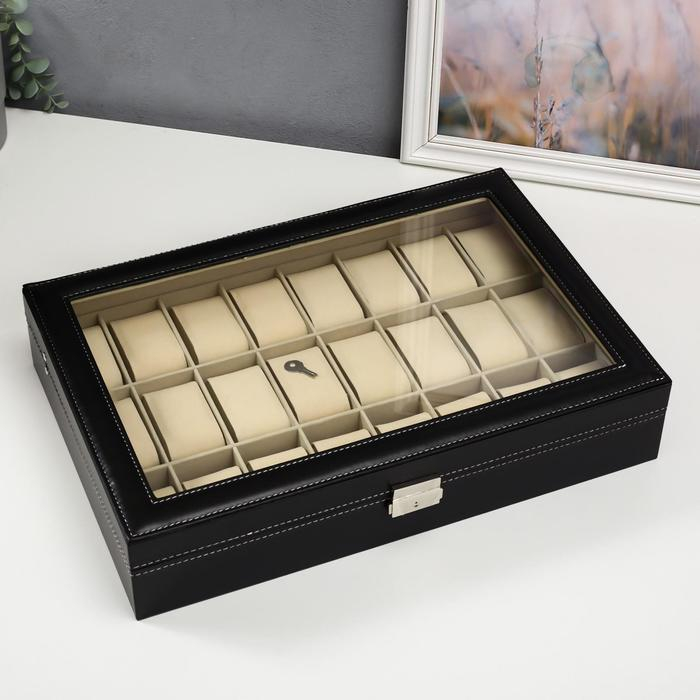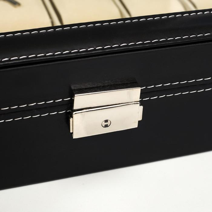 Шкатулка кожзам под часы 24 отделения "Чёрная с белой строчкой" 8,5х43,5х29,5 см