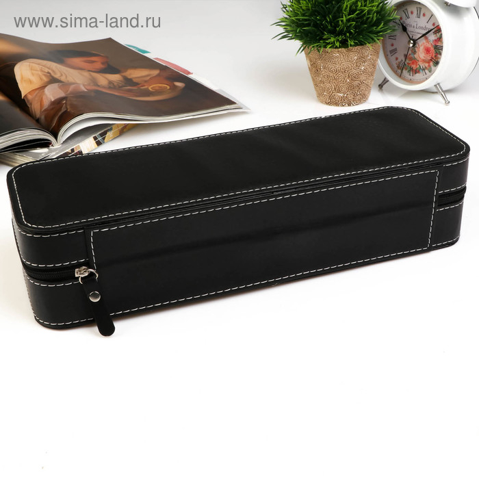 Шкатулка кожзам под часы 6 отделений "Чёрная с белой строчкой" на молнии 7,5х11х33 см