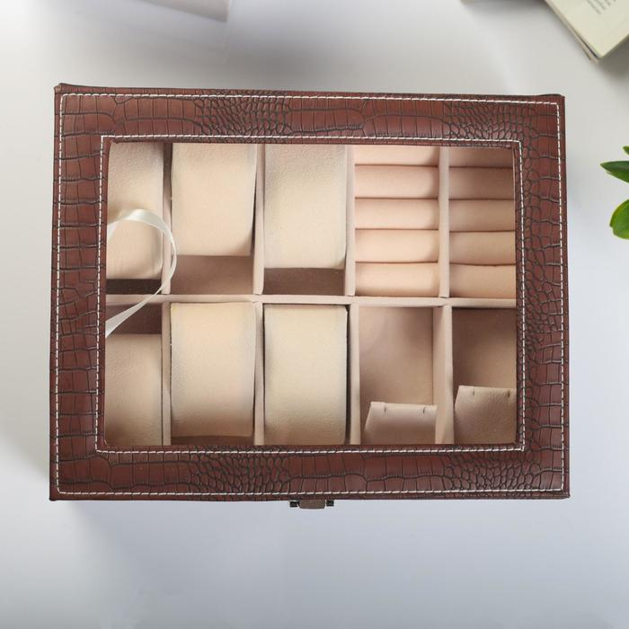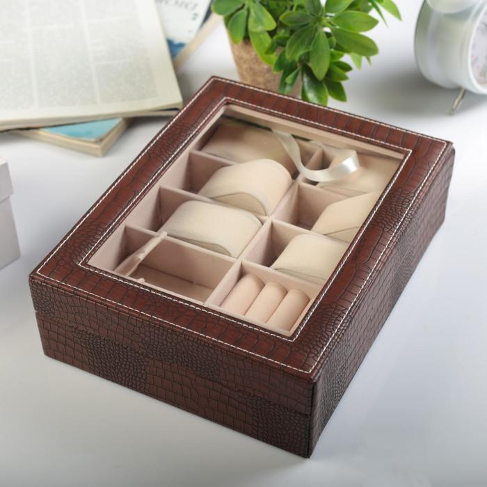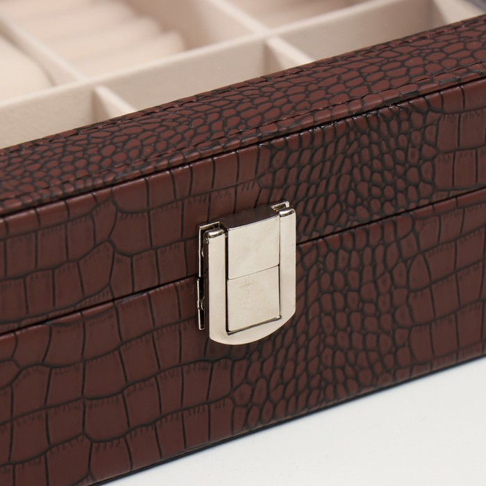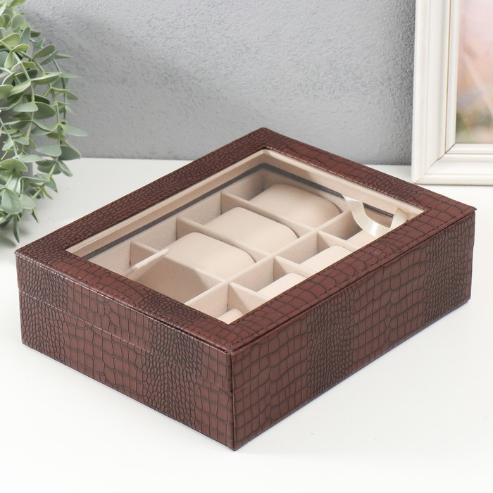 Шкатулка кожзам под часы 6 отделений и бижутерию "Кофейный питон" матовая 7,7х20х25,5 см