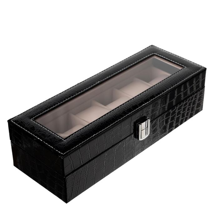 Шкатулка кожзам под часы 6 отделений "Карбон с красной строчкой" 8х33х12 см