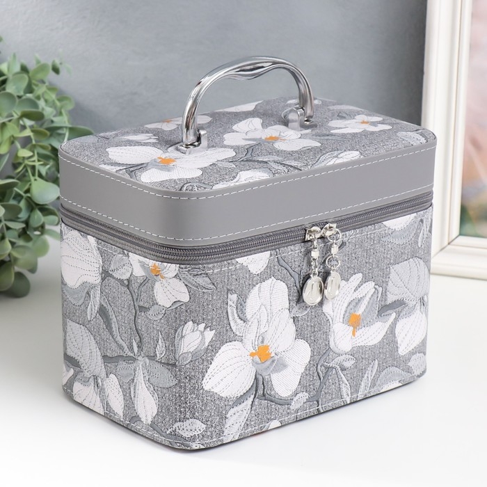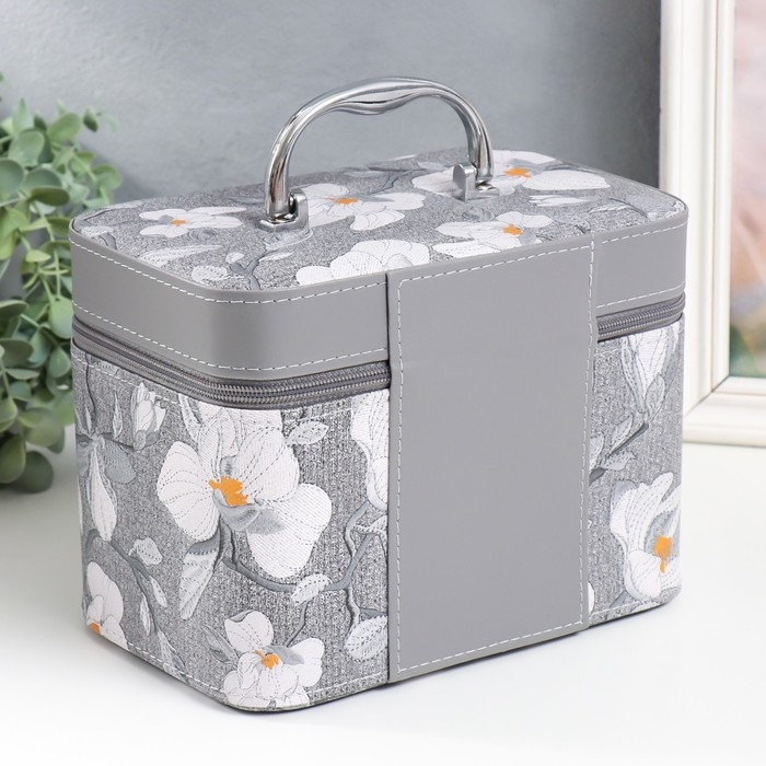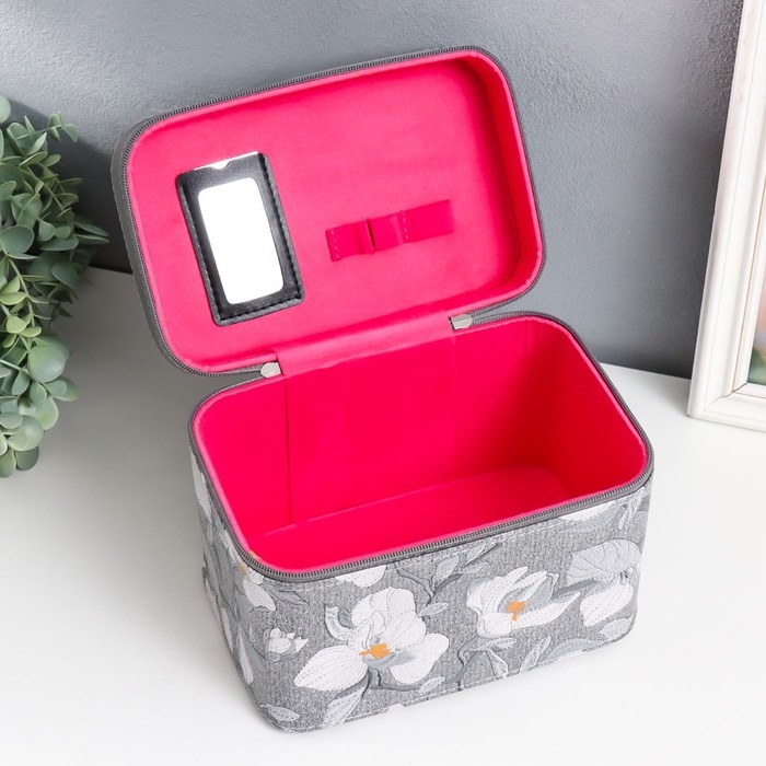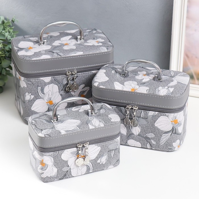 Шкатулка кожзам с зеркалом "Цветы. Серый" набор 3 шт 18х10х12,5 21х13х15,5 23х15х18,5 см