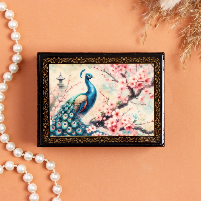 Шкатулка «Павлин и сакура», черная, 8×10,5 см, лаковая миниатюра