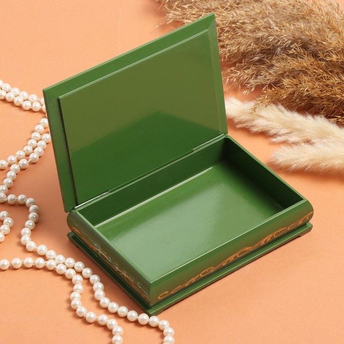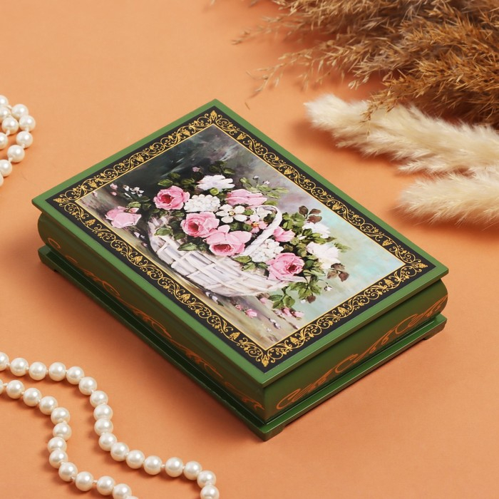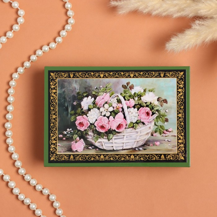 Шкатулка «Розы с полевыми цветами в корзине», зелёная, 11×16 см, лаковая миниатюра