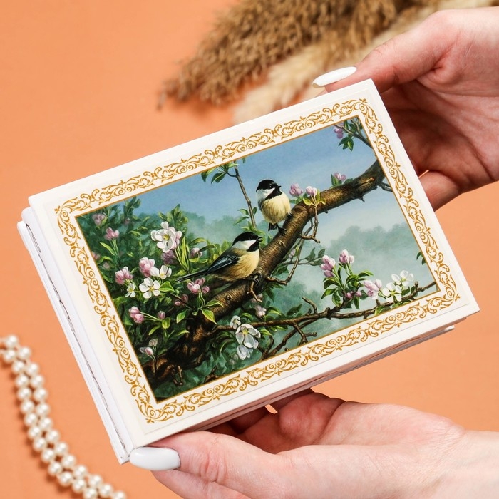 Шкатулка «Синички на ветке», белая, 11×16 см, лаковая миниатюра
