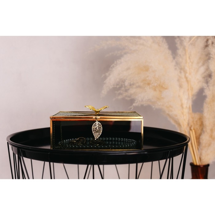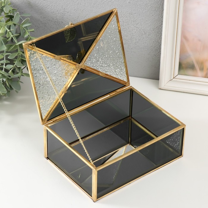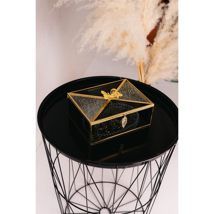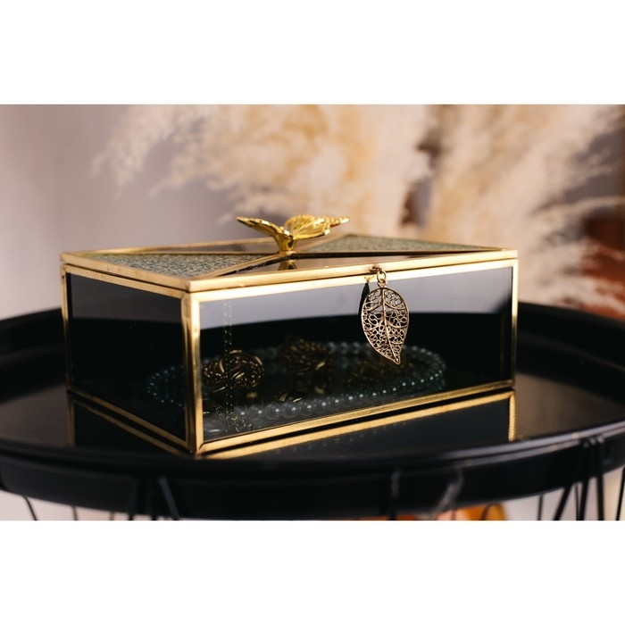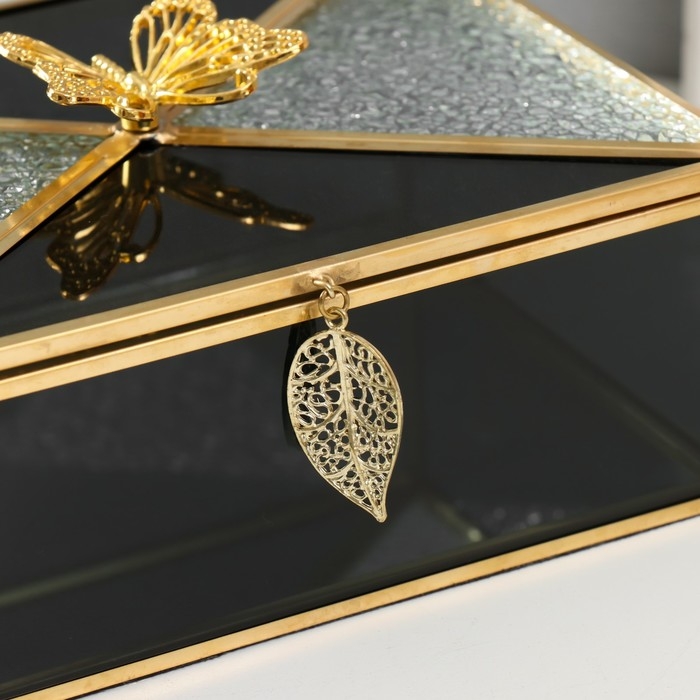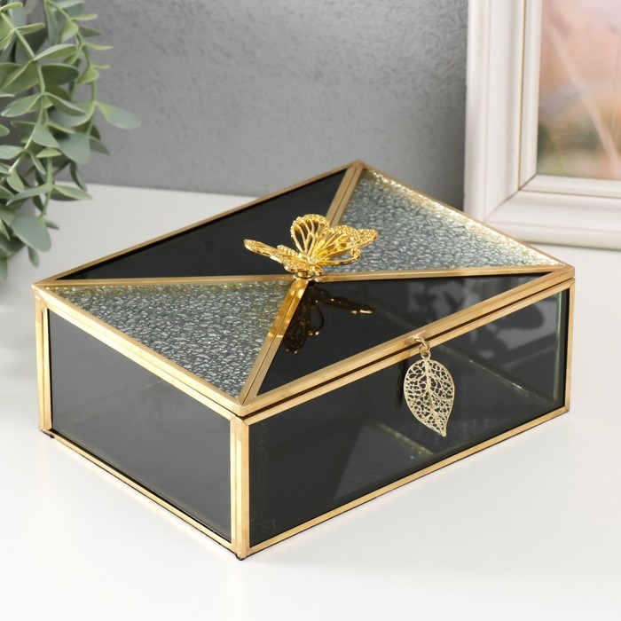 Шкатулка стекло с металлическим каркасом "Бабочка и лист" чёрная дымка 18,7х14,6х9 см