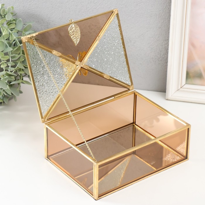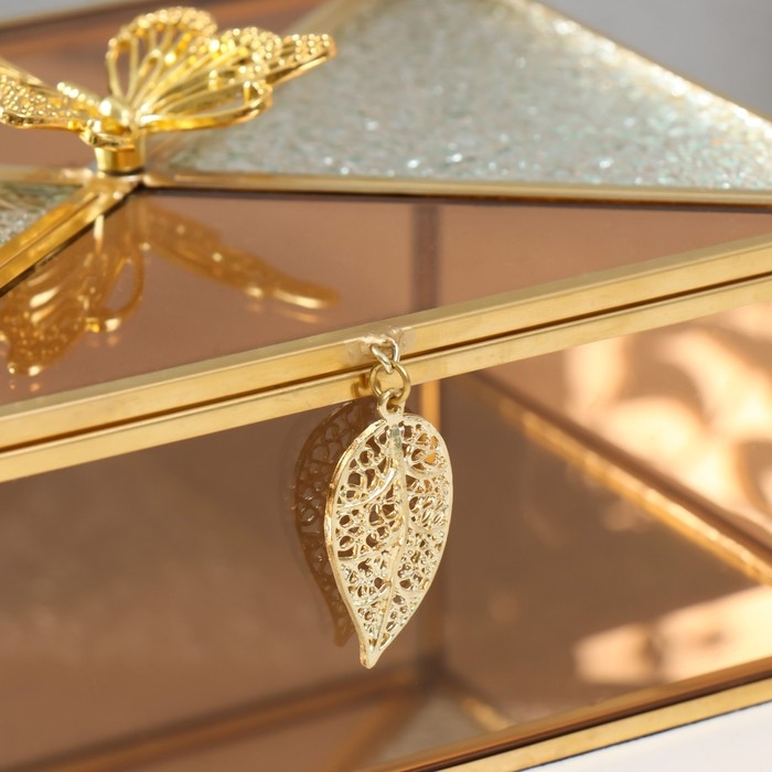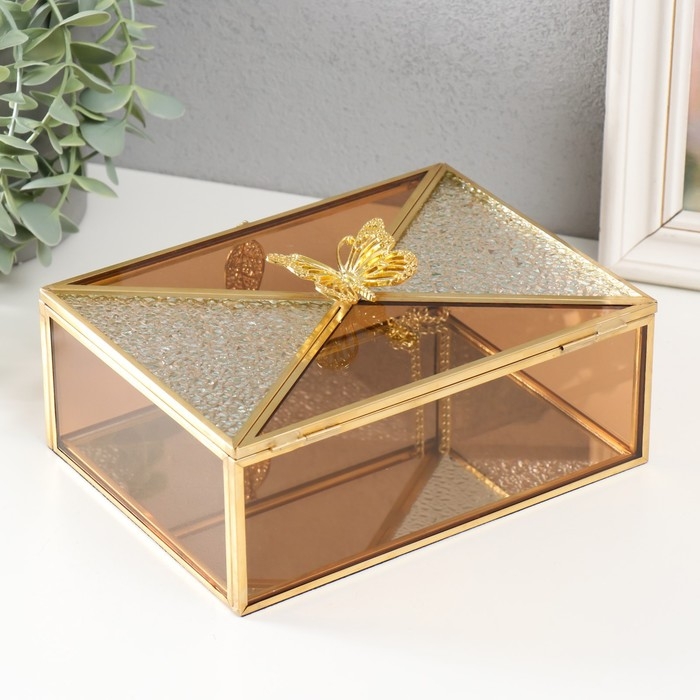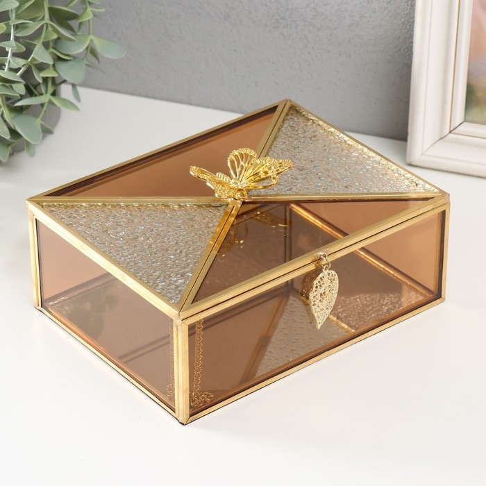 Шкатулка стекло с металлическим каркасом "Бабочка и лист" карамель 18,7х14,6х9 см