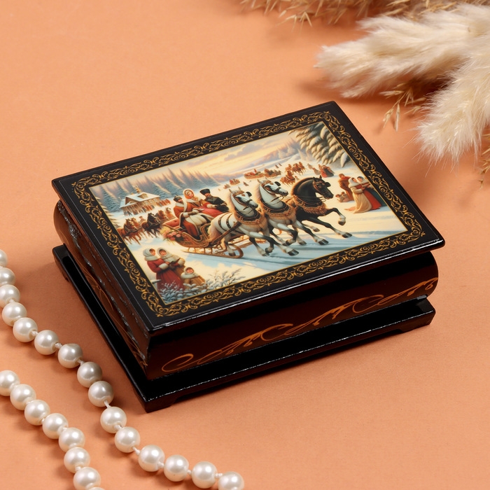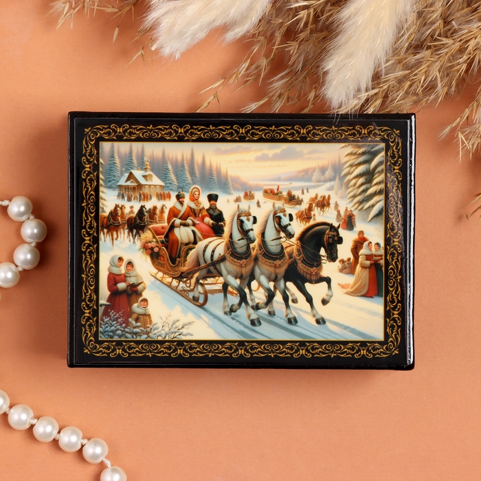 Шкатулка «Тройка зимняя», черная, 8х10,5 см, лаковая миниатюра