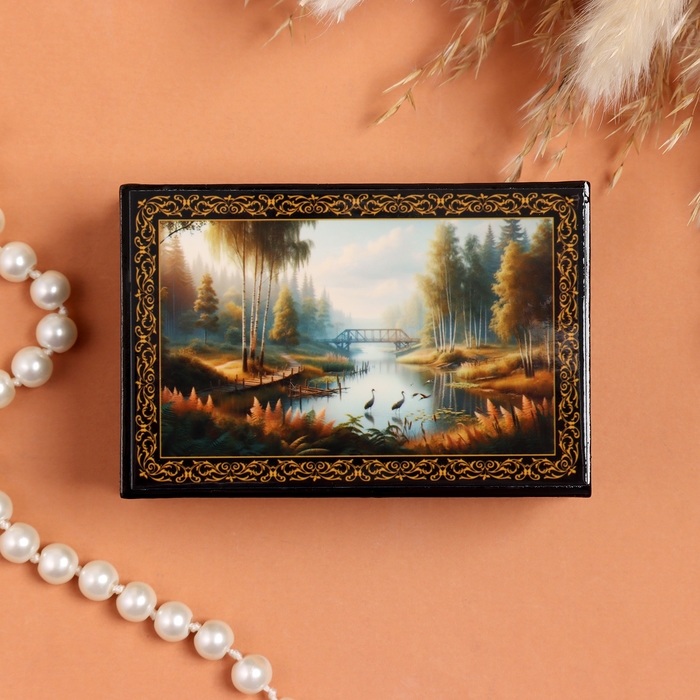 Шкатулка «Журавли на пруду», черная, 6×9 см, лаковая миниатюра