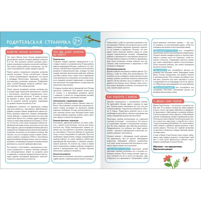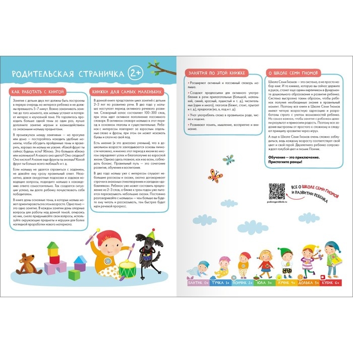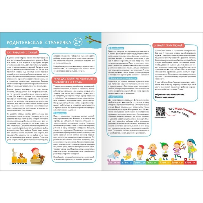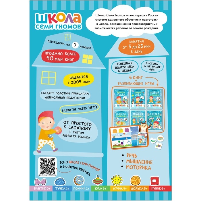 Система выстроена таким образом, чтобы ребёнок получил необходимые знания в правильный момент. Поэтому все книги в Школе Семи Гномов имеют четкую возрастную адресацию и разработаны строго с учётом возрастных возможностей ребёнка. Но самое важное, чтобы занятия с ребёнком давали результат и приносили радость. Поэтому все задания выстроены от простого к сложному и следуют принципу «развитие через игру». Заниматься с ребёнком может любой взрослый, специальных знаний и опыта не требуется. Родительская страничка в каждой книге подскажет, что, как и почему нужно развивать в данном возрасте.
