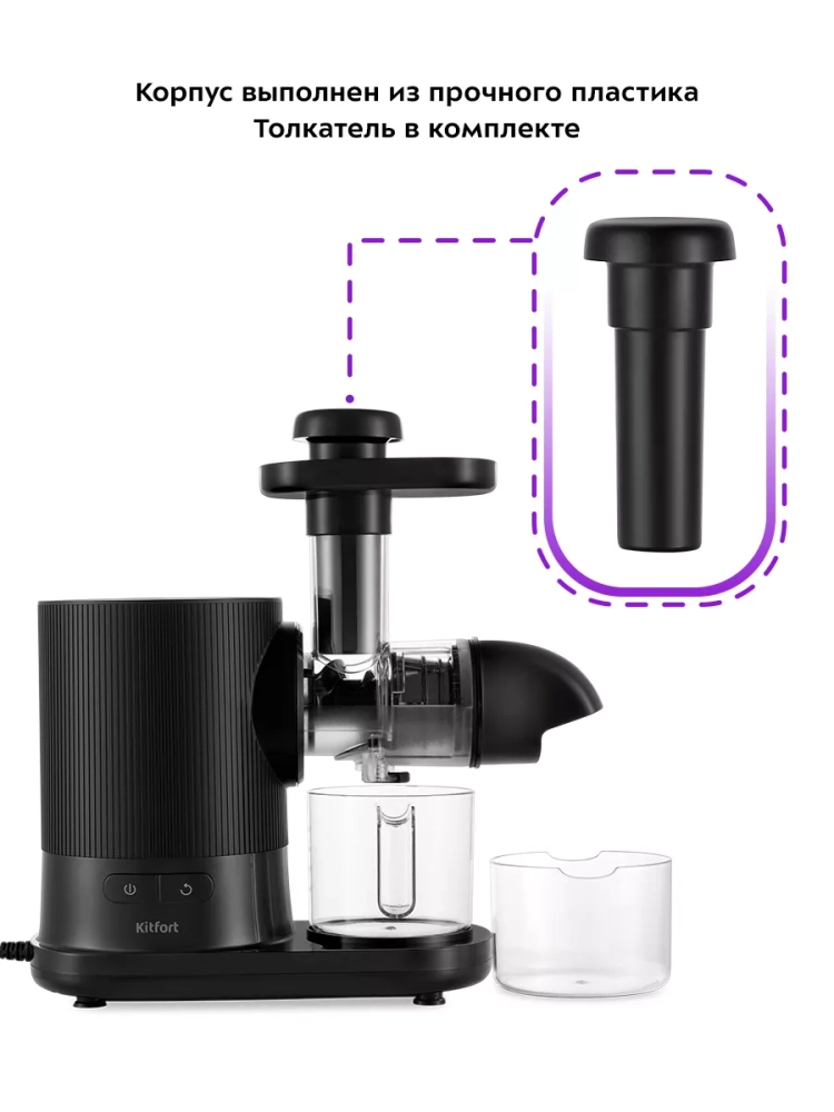 Корпус соковыжималки KT-1139 выполнен из прочного пластика, выдерживающего большие нагрузки. В случае загрязнения его легко протереть тканью или губкой.