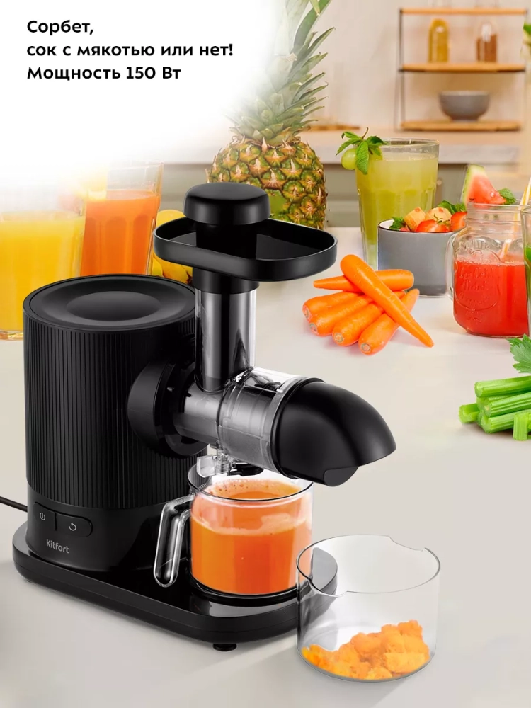 Шнековая соковыжималка Kitfort KT-1139 позволяет отжимать максимально возможное количество сока из фруктов, большинства овощей и зелени с сохранением всех их полезных компонентов: витаминов, аминокислот и минералов. Благодаря наличию разных фильтров в комплекте в соковыжималке можно приготовить сок с мякотью или без и фруктовый сорбет. Соковыжималка легко собирается и просто моется после работы.
