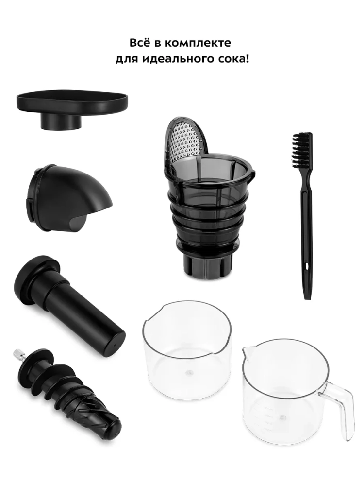 В комплекте предусмотрены толкатель для безопасного проталкивания продуктов, прозрачные контейнеры для сока (0,5 л) и жмыха (0,5 л), загрузочный лоток. Использование лотка сделает вашу работу с соковыжималкой более комфортной, например, при получении сока из ягод.