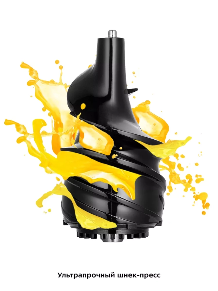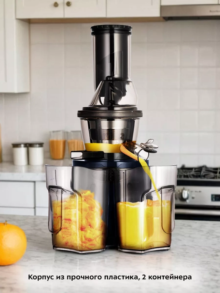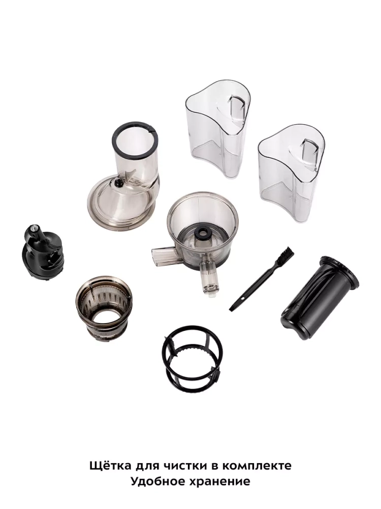 В комплекте предусмотрены толкатель для безопасного проталкивания продуктов, прозрачный контейнер для жмыха (1 л) и такой же контейнер для сока. Широкая загрузочная горловина позволяет загружать продукты, не нарезая их слишком мелко, что ускоряет процесс приготовления сока.
