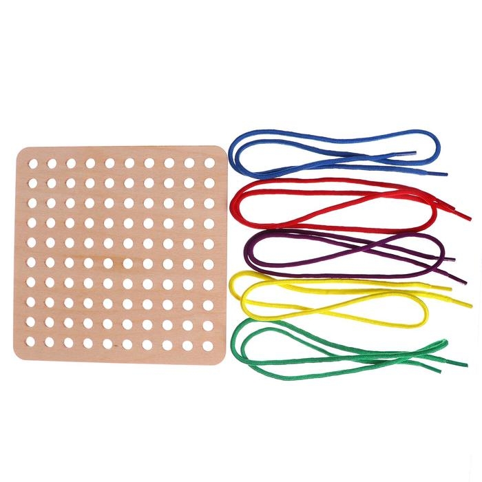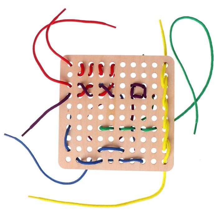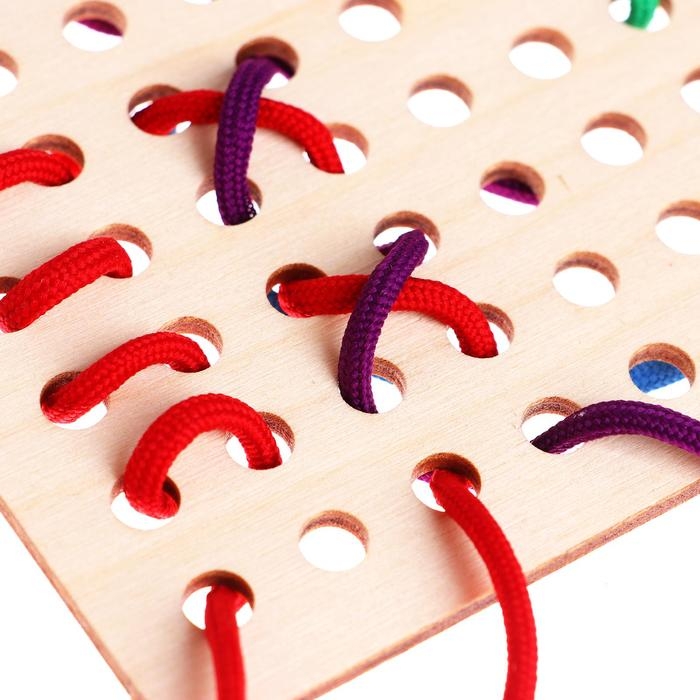 - Развивает мелкую моторику: работа с шнурком и деталями тренирует ловкость, координацию движений и точность пальцев.