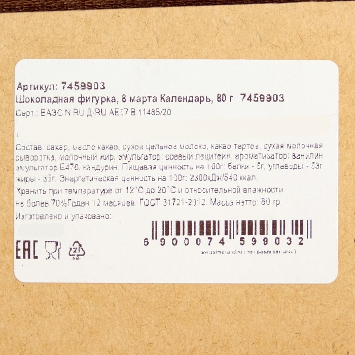 Шоколадная фигурка «8 марта. Календарь», 80 г