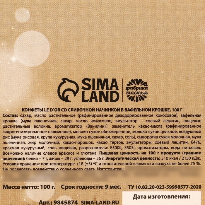 Состав: сахар, масло растительное (рафинированное дезодорированное кокосовое), вафельная крошка (мука пшеничная, сахар, масло кокосовое, эмульгатор- соевый лецитин, пищевые растительные волокна, ароматизатор "Ванилин"), заменитель какао-масла (рафинированноегидрогенизированное пальмовое), молоко сухое обезжиренное, молоко сухое цельное, воздушный рис (мука рисовая, крупа кукурузная, мука пшеничная, сахар, соль), сыворотка сухая молочная, мука пшеничная жир молочный, какао-порошок, какао тёртое, эмульгаторы: соевый лецитин, Е476, крахмал кукурузный, соль пищевая, разрыхлители: Е500ii, Е503i, ароматизаторы, вода питьевая.