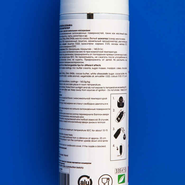 Перед использованием баллон должен находиться в теплом помещении в течение часа, и иметь температуру около 30С. Перед нанесением спрея-велюра кондитерские изделия должны быть охлаждены в морозильной камере и иметь температуру не выше минус 20С. Спрей наносить на поверхность торта на расстоянии 20 см при помощи коротких нажатий.