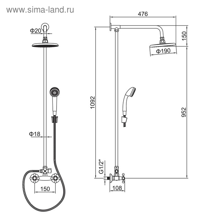 Штанга со смесителем Accoona А8176-1, двухрычажная, с тропическим душем, хром
