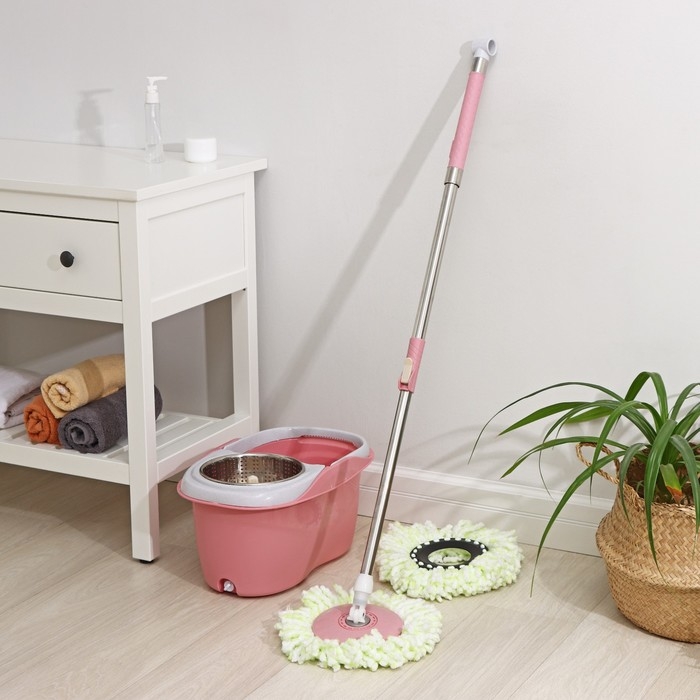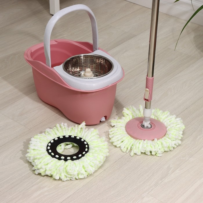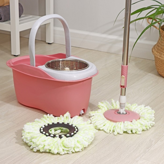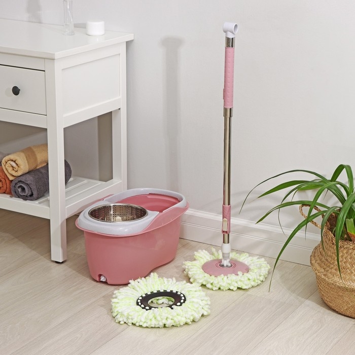 Швабра с отжимом и ведро с металлической центрифугой Доляна, 46,5×28,5×23,5 см, 10 л, телескопическая ручка 86-117,5 см, дополнительная насадка из микрофибры 15,5 см, цвет розовый