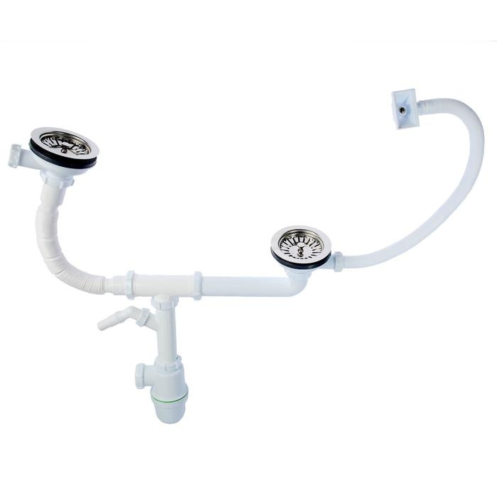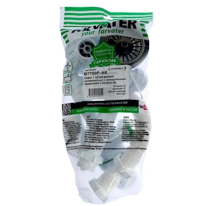 Сифон для мойки Akvater, 3 1/2" х 40 мм, двойной, прямоуг. перелив, отвод для стир. машины