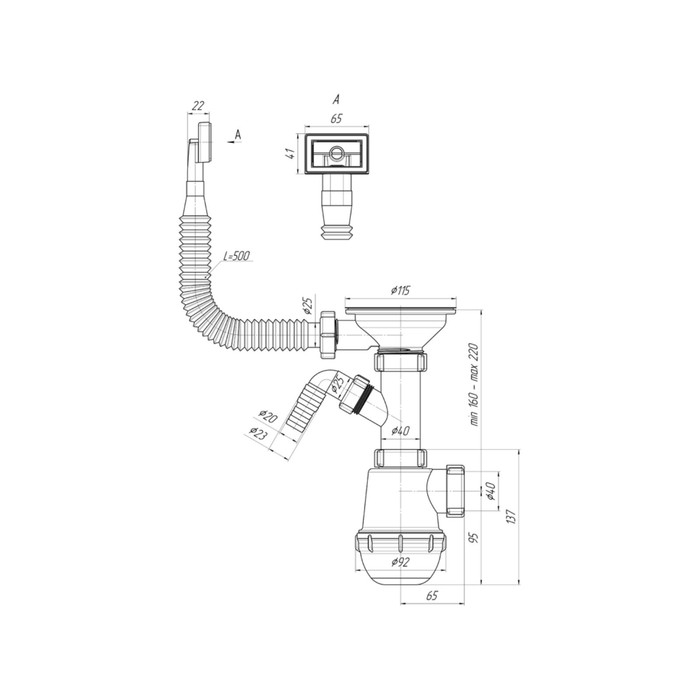 Сифон для мойки "АНИ Пласт" Грот A1045SА15, 3 1/2", прямоуг перелив, отвод, гофра 40x40/50мм