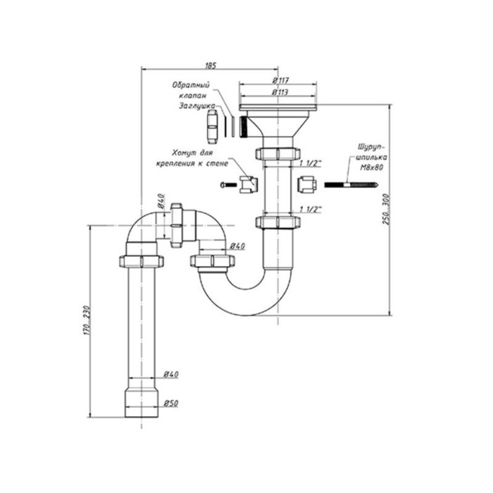 Сифон для мойки ORIO RS-41078, 1 1/2"х40 мм, нерж. решетка d=113 мм, с трубой 40х40/50 мм