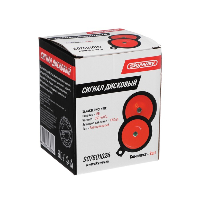 Сигнал звуковой дисковый Skyway 024 - это высококачественный автомобильный сигнал, который обеспечивает громкий и мощный звук для повышения безопасности на дороге. Он имеет диаметр диска 90 мм и работает от напряжения 12 вольт, создавая уровень звукового давления до 105 дБ. Металлический корпус обеспечивает прочность и долговечность сигнала, а его дисковая форма позволяет получить более широкий и глубокий звук. В комплекте идут два таких сигнала, что дает возможность установить их в передней и задней частях автомобиля для улучшения слышимости. Этот звуковой сигнал подходит для использования на автомобилях, мотоциклах и другой технике, где требуется надежный и мощный звуковой сигнал.