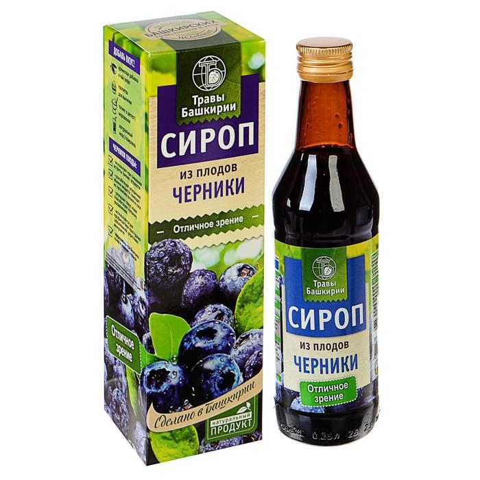 Ягоды черники уменьшают усталость глаз при продолжительной работе в искусственном освещении, усиливают остроту зрения, улучшают зрение в условиях низкой освещённости, помогают глазам быстрее адаптироваться в сумерках и темноте. Черника улучшает кровообращение сетчатки глаз и ускоряет её обновление. Кроме того, черника широко применяется не только для уменьшения утомляемости глаз и улучшения зрения, но и как противоопухолевое средство, как хорошее противопростудное средство, при гинекологических заболеваниях, при заболеваниях желудочно-кишечного тракта, при гипертонии, и как средство, замедляющее процесс старения. Регулярное употребление натурального сиропа "Из плодов черники": - улучшает адаптацию зрения в темноте; - укрепляет капилляры глаз; - поддерживает органы зрения необходимыми питательными веществами - витаминами и микроэлементами; - стимулирует циркуляцию крови в органах зрения; - снижает внутриглазное давление; - обладает выраженными антиоксидантными свойствами, т.е. предотвращает повреждение тканей глаза свободными радикалами; - обладает противоопухолевым и противопростудным действием; - улучшает работу ЖКТ; - способствует замедлению процесса старения. Экстракт черники способствует регенерации светочувствительного пигмента сетчатки, повышая ее чувствительность к изменениям интенсивности света, улучшая остроту зрения при пониженной освещенности. Активные вещества черники помогают увеличить приток крови к сетчатке глаза. Также, сироп из плодов черники оказывает противомикробное действие и способствуют заживлению повреждений (после оперативного вмешательства на глазах). Восстановительный курс после перенесенной операции - 10 флаконов единовременно (без перерыва).