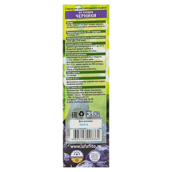 Сироп на растительном сырье «Из плодов черники», 240 мл