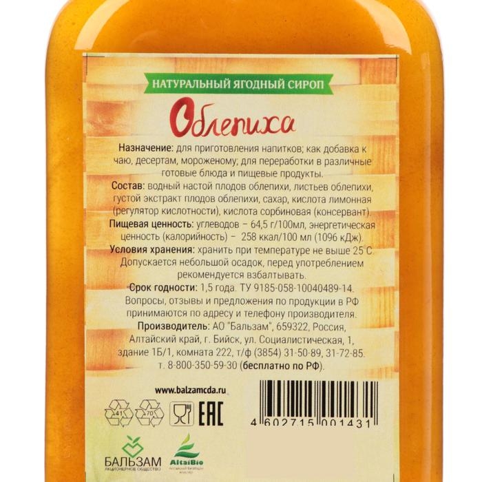 Полезный натуральный сироп. Ягоды облепихи обладают множеством оздоровительных эффектов. Всем известно ее заживляющее и противовоспалительное действие. При регулярном употреблении облепихового сиропа кожные заболевания в виде дерматитов перейдут в ремиссию, так же рекомендуется употреблять при простудных заболеваниях, для поддержания иммунных сил организма, авитаминозе и недостатке витамина С. Жирные кислоты, которыми богата ягода, улучшают усвоение белка, поэтому сироп поможет сбалансировать рацион питания людям, желающим похудеть. Не содержит красителей и ароматизаторов.
