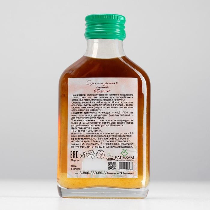Сироп натуральный ягодный «Облепиха» Целебный Дар Алтая, флакон 100 мл