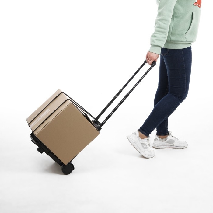 Максимальная нагрузка тележки составляет 30 кг позволяет переносить различные предметы, включая сумки, чемоданы, ящики, коробки и другие грузы. Телескопическая ручка с тремя ступенями регулировки легко адаптируется под рост пользователя.