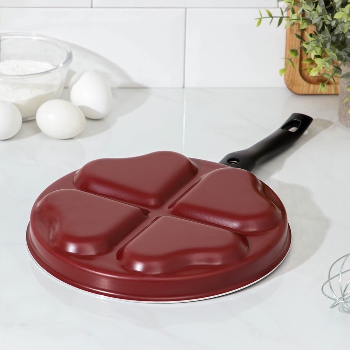 Аккуратные оладьи или воздушные блинчики в виде сердечек — теперь вы сможете вызывать восторг каждым своим блюдом, а сковорода Happy Heart, d=26 см, пластиковая ручка, антипригарное покрытие, цвет бордовый поможет вам в этом.