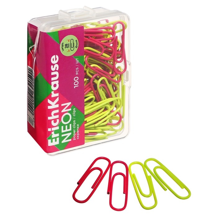 Скрепки канцелярские 28 мм, 100 штук, ErichKrause Neon, цветные с виниловым покрытием, пластиковая коробка, МИКС
