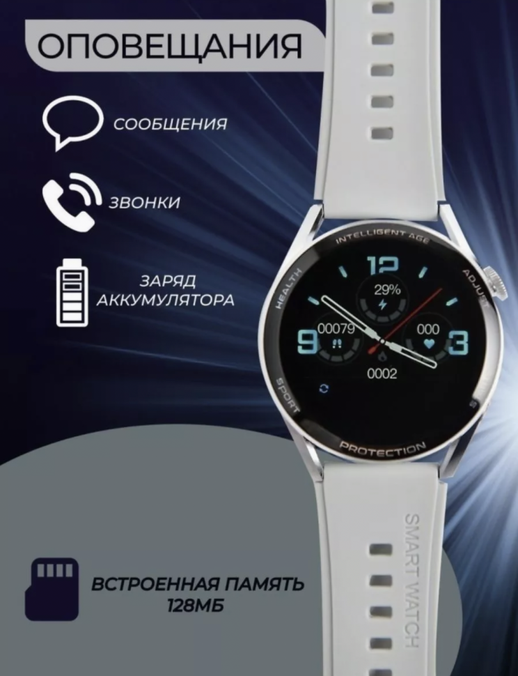 В комплекте смарт-часы, 2 ремешка (серый силикон и коричневый под кожу), магнитная зарядка, упаковка, инструкция.