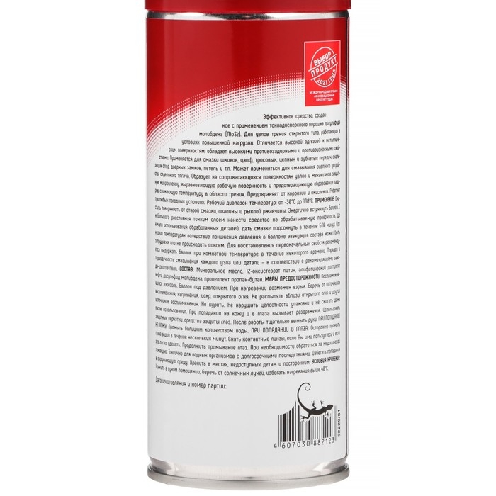 Молибденовая смазка 3ton ТС-563 520мл - новейшее средство, созданное на основе дисульфида молибдена (MoS2).Смазка отличается высокой адгезией к металлическим поверхностям, проявляет прекрасные противозадирные и противоизносные свойства и является незаменимым средством при работе в условиях загрязнением пылью, грязью, осадками и при высокой температуре.Применяется для смазки шкивов, цапф, тросовых, цепных и зубчатых передач, скользящих опор, дверных замков, петель и т.п.Может применяться для смазывания сцепного устройства седельного тягача.Работает при любых погодных условиях. Устойчива к воздействию воды. Интерна к соли и кислотным осадкам.ПРИМЕНЕНИЕ:Очистить поверхность от старой смазки, окалины и рыхлой ржавчины.Энергично встряхнуть баллон.С небольшого расстояния тонким слоем нанести средство на обрабатываемую поверхность.До начала использования обработанных деталей, дать смазке подсохнуть в течение 5-10 мин