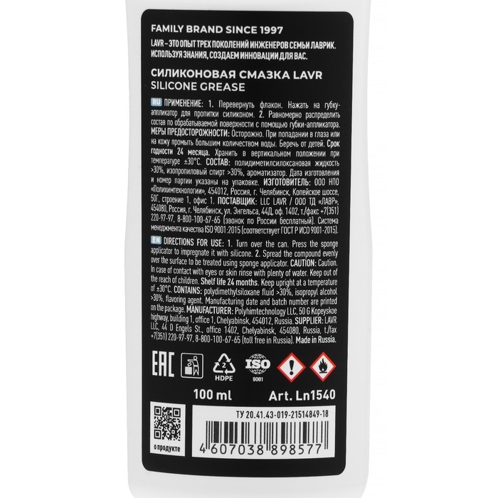 Силиконовая смазка для резиновых уплотнителей LAVR – средство для обработки резиновых уплотнителей дверей, люка, багажника, капота в автомобиле.