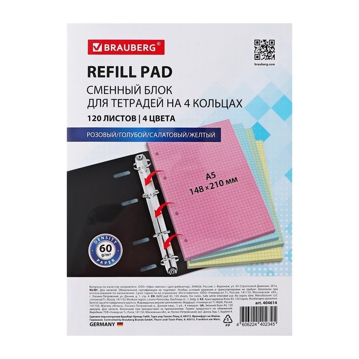 Откройте для себя многофункциональный и стильный сменный блок для тетрадей на кольцах формата А5 от BRAUBERG. Этот набор включает 120 листов, разделенных на четыре ярких цвета — розовый, жёлтый, зелёный и голубой, что делает его идеальным для организации записей и выделения важных заметок.