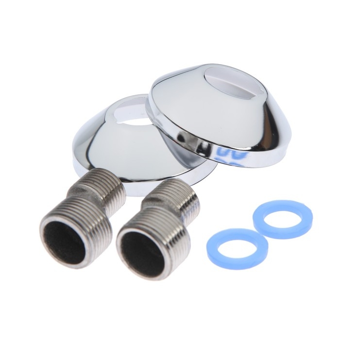 Комплект пристенного крепления включает в себя уплотнительные прокладки, эксцентрики и глубокие хромированные чашки отражателей. Дивертор (переключатель) с излива на душ — шарового типа.