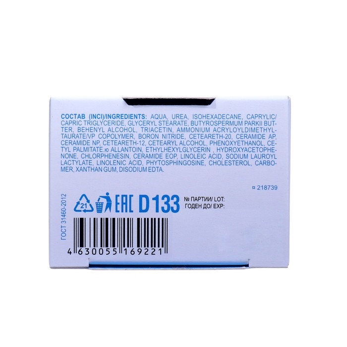 Состав: aqua, urea, isohexadecan, caprylic/capric triglyceride, glyceryl stearate, butyrospermum parkii butter, behenyl alcohol, triacetin, ammonium acryloyldimethyltaurate/vp copolymer, boron nitride, ceteareth-20, ceramide ap, ceramide np, ceteareth-12, cetearyl alcohol, phenoxyethanol, cetyl palmitate, allantoin, ethylhexylglycerin, chlorphenesin, ceramide eop, linoleic acid, sodium lauroyl lactylate, linolenic acid, phytosphingosine, disodium edta, cholesterol, carbomer. xanthan gum.
