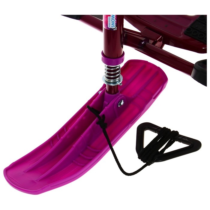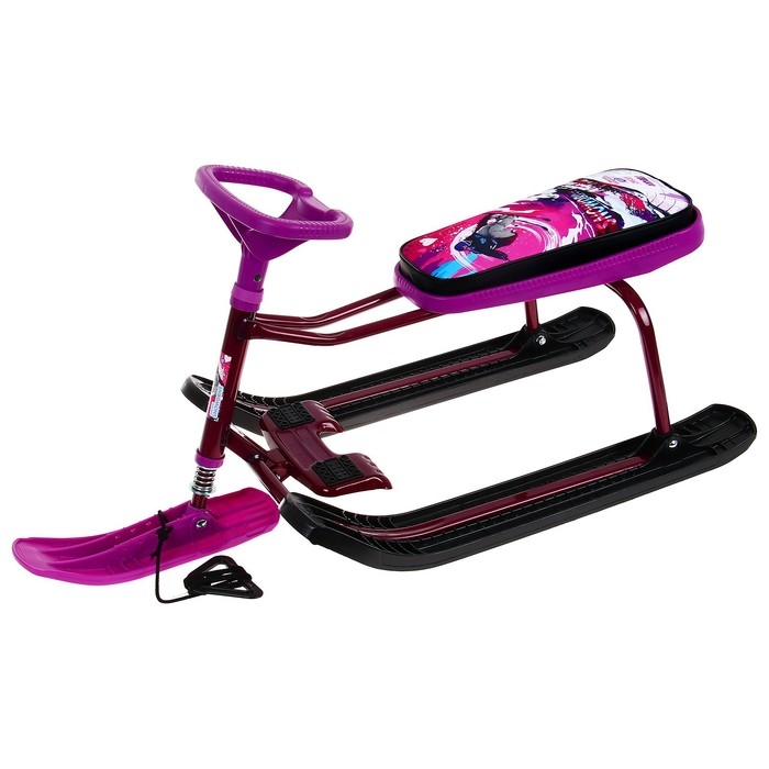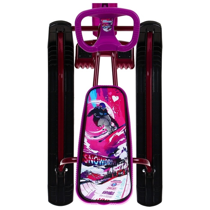 Снегокат предназначен для перевозки детей по плотному снегу или льду, катанию с горок. Имеет сварную конструкцию из стальных труб, пластиковых элементов и мягкое сиденье, обтянутое искусственной кожей с рисунком. Оснащён буксировочным тросом и системой амортизации, которая обеспечивает комфортную поездку по крутым горкам и неровным поверхностям. Усиленный тормоз эффективен на обледенелой поверхности. В комплект входит набор наклеек на снегокат.