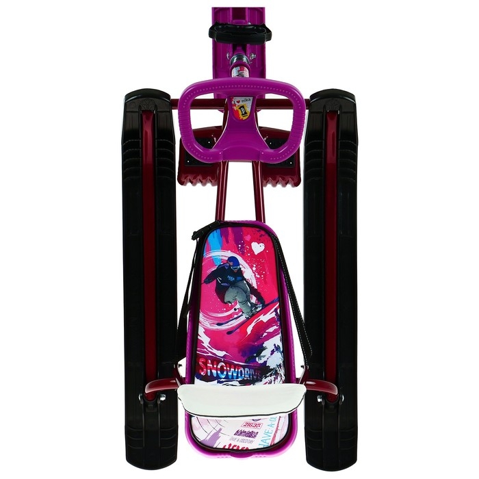 Снегокат предназначен для перевозки детей по плотному снегу или льду, катанию с горок. Имеет сварную конструкцию из стальных труб и пластиковых элементов. Оснащён мягким сиденьем, обтянутым искусственной кожей с рисунком, складной спинкой и двухточечным ремнём безопасности. Оборудован буксировочным тросом с автоматической намоткой и системой амортизации, которая обеспечивает комфортную поездку по крутым горкам и неровным поверхностям. Усиленный тормоз эффективен на обледенелой поверхности.